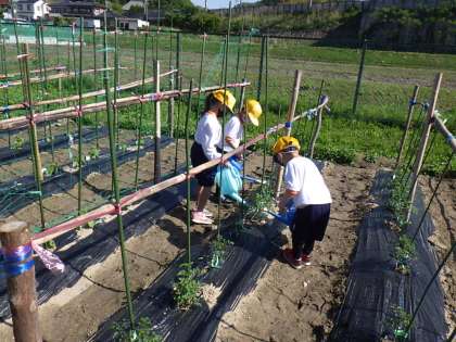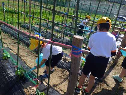 1年生の子たちは、朝登校したら、友だちと一緒に仲良く畑に行って水やりをしています。