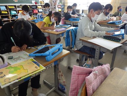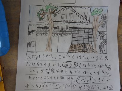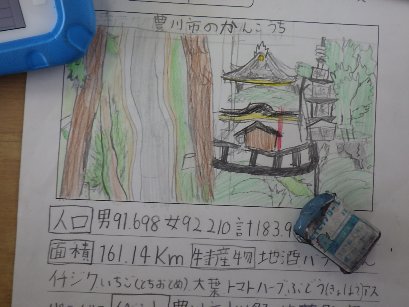 4年生の社会科では「わたしたちの県」を学習しています。子どもたちは愛知県内の市町を一つ選び、その市町の特徴をインターネットで調べて、まとめています。その市町のお城をうまく描き、さらに人口や面積などを調べて、小さなガイドブックのようにまとめている子もいました。
