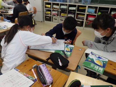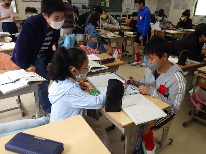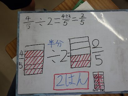 6年生の算数では、4/5÷2の計算方法を考えました。いつものようにグループになり、ホワイトボードに図を書きながら、考えました。グループの中で説明をしあう事で、「4/5÷2とは、どういう状態を聞かれているのか」考え合いました。子どもたちの考えが深まっていきました。