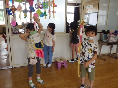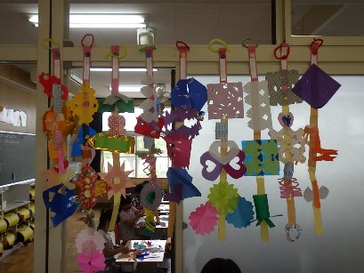 1年生の図工では、「チョキチョキかざり」を作りました。折り紙を折ってハサミで切って美しい模様を作り、それを縦につなげて七夕のような飾りを作ります。1年生は器用にハサミを動かして、思い思いの模様をつくり、カラフルな飾りに仕上げました。