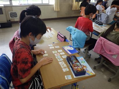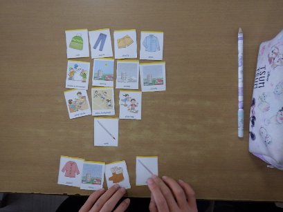 4年生の外国語では、リスニングゲームを行いました。子どもたちそれぞれが16枚のカードを持っていて、教師がそのうちの5枚を読み上げます。子どもたちは聞き取った順に、5枚のカードを机の上に並べ、聞き取った順に並んでいるか答え合わせをしました。「やった!3問正解!」と、歓声があがりました。