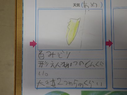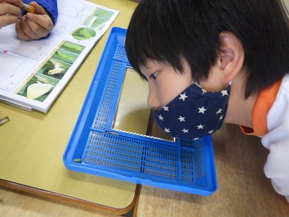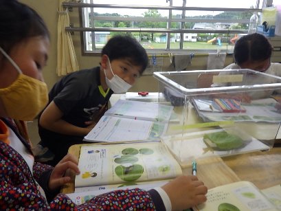 3年生の理科では、モンシロチョウの幼虫やさなぎの観察をして、ノートに絵を描きました。幼虫やさなぎに目を近づけ、「先生、ここから白い糸がでているんだよ」と、教えてくれました。