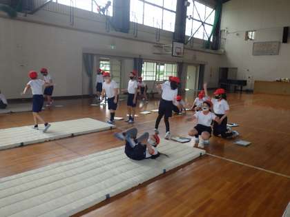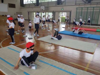 今日は、4年生の復習で前転、後転、開脚後転をしました。