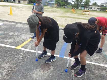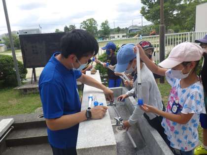 今日は、注射器に水をいれてピストンを力いっぱい押しても、空気のときのように体積が変わらないことに気がつきました。子どもたちは、もう少しピストンが押せると思っていたようですが、ほとんど体積が変わらないことに驚いていました。