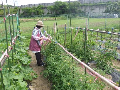 6/14月のサツマイモの苗植えに向けて、野菜名人さんが準備をしてくださいました。耕運機で耕し、肥料をまいて畝をつくって、マルチをかけました。また、夏野菜が大きく育ってきているため、支柱に結わいてくださいました。あとは、サツマイモの苗を植えるだけです。