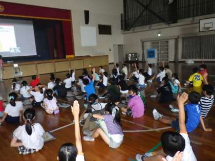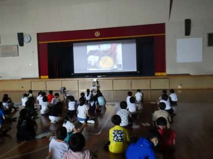 東京のスタジオと学校の体育館をオンラインで結んで、講師の先生からマヨネーズ作りの秘密について学習しました。