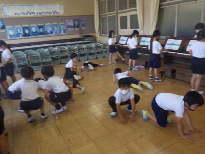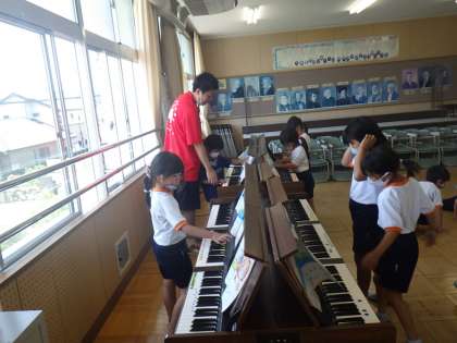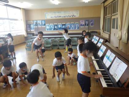 2年生の音楽では、「かえるのうた」を子どもたちが弾くオルガンに合わせて、曲にのって身体表現をしました。