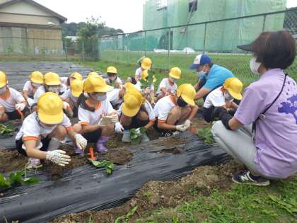 1・2年生は、雨で順延となっていた「さつまいもの苗差し」をしました。