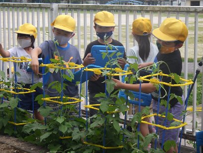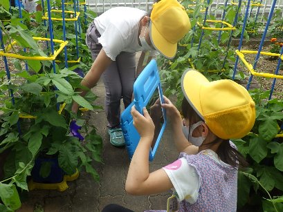1年生は、5月12日にアサガオの種を植え、毎日水やりと観察を続けてきました。今日はタブレットを使って写真を撮り、アサガオの観察をしました。1年生の子どもたちは、アサガオにつぼみや花がついていることを見つけ、それを写真に撮っていました。お友達が花の写真を撮りやすいように、葉っぱを持ち上げて協力する姿がみられました。