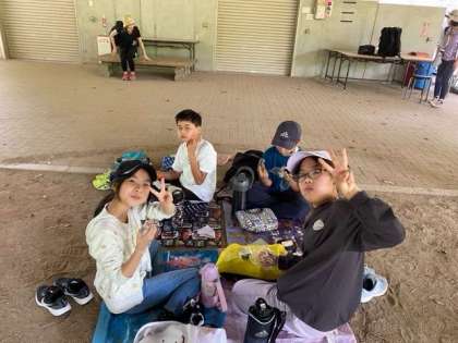 日差しが暑かったので、急きょ屋根のあるファイヤー場で食べました。