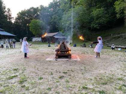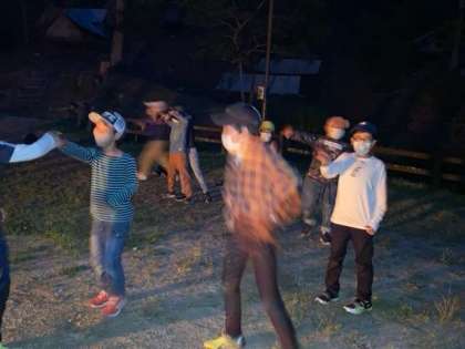 いよいよ、メインイベントのキャンプファイヤーです。火の女神による点火のあと、集会委員による司会進行で楽しくゲームをしました。