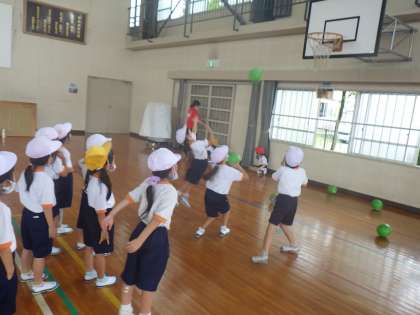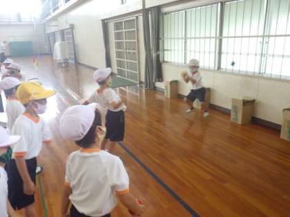 ボールを「箱に入れる」「バスケットゴールに入れる」「コーンに当てる」などの課題の用意された4つのサーキットを回りながら、投げる動作を取り入れた運動をしています。