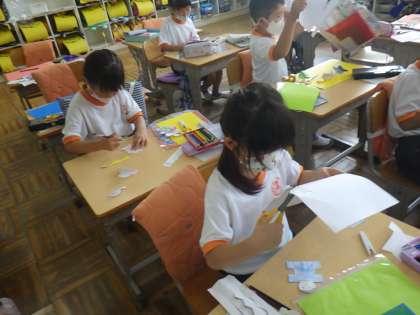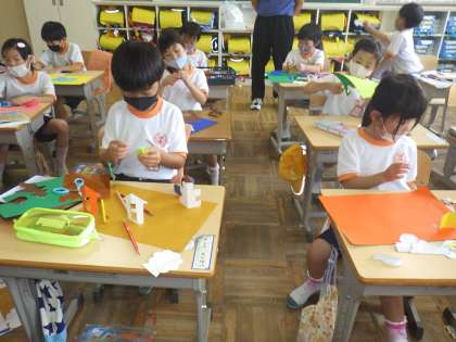 1年生の図工では、色紙を切って建物は動物などをつくり、画用紙にはって立体的な作品を作っています。