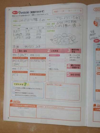 課題は、朝食でいためものを1品作り、ワークシートにまとめます。