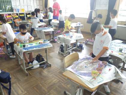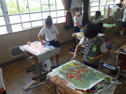 2年生の図工では、「とろとろえのぐ」を使って、思い思いに画用紙に色を塗りました。