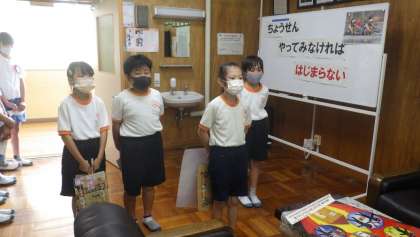 夏休み前の全校集会がありました。校長先生からは、「あいさつ、返事、ありがとう」の中で特に「止まってくれた車にありがとう」がよくできるようになったと、褒めていただきました。また、東京オリンピックが始まることから、「全校のみんなも、興味をもったことに挑戦してみよう!」というお話がありました。