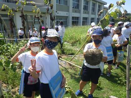3年生は、理科で育ててきたひまわりのたねを収穫しました。
