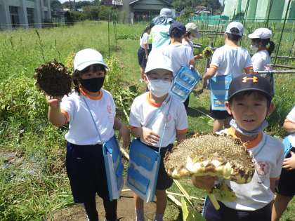 自分の顔よりも大きなひまわりの花にできたたくさんの種に驚きの声をあげていました。