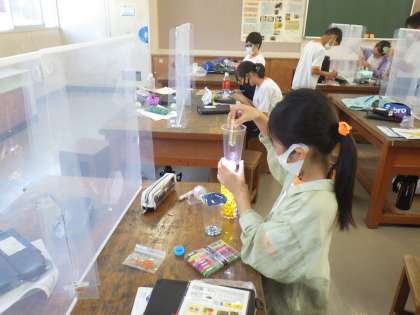 5年生の図工では、「光と場所のハーモニー」という題で、ペットボトルを利用して光で表現する作品を作っています。