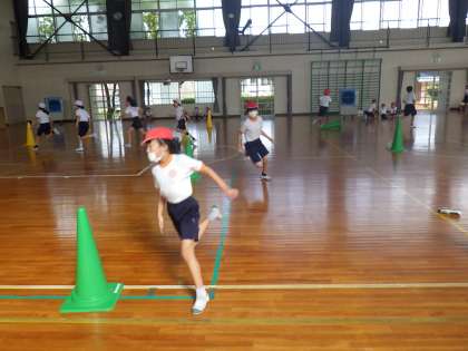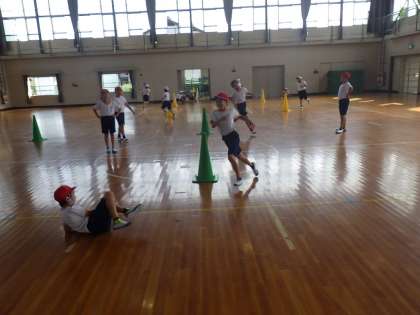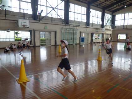 4年生の体育では、コーンの周りをぐるぐる走りながら、前を走る子をタッチするおにごっこをしていました。
