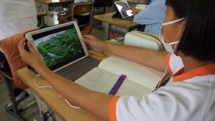 5年生の社会科では、農業について学んでいます。今日はタブレットを使って、新しい農業の取組について調べました。児童は、ドローンやロボットなど最新技術を使った農業の様子を動画で視聴したり、野菜工場のような取組の画像をみたりして、これからの農業についてまとめていました。