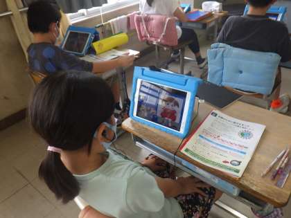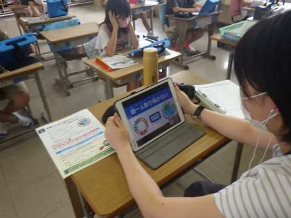タカラトミーのスタジオと教室を一人一人のタブレットで結んで、いろいろな質問に答えたりしながら、楽しく学ぶことができました。私も校長室から参加させていたきました。