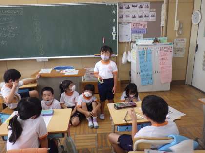 音楽に合わせて「タン、タン、タン」とリズム打ちをして、みんなの前で発表をしました。