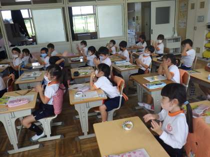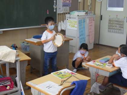 1年生の音楽では、タンバリン、スズ、トライアングルなどでリズム打ちをしました。