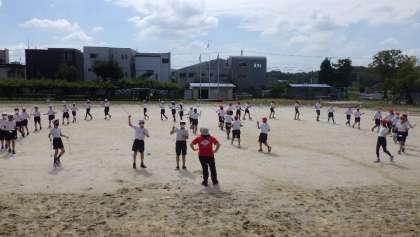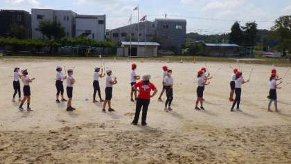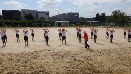 6年生は体育で、伊保っ子体育フェスタに向けて練習が始まっています。今週は5年生に教えられるように、6年生だけでトーチワークの隊形移動を練習しています。音楽に合わせて、トーチを回しながら隊形を移動し、きれいな円を作りました。