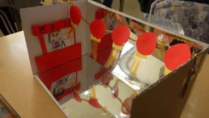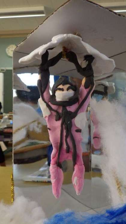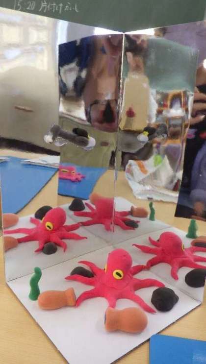 5年生の図工では、紙粘土を使って「ミラクル ミラーステージ」を作っています。紙粘土を絵の具で着色し、鏡のように反射するステージの前に、自分の思い描いた世界を紙粘土で表現します。細部にこだわって、作品を仕上げていました。