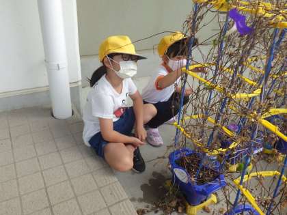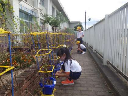 1年生は、朝、自分のあさがおの所に行って、せっせと種を収穫しています。