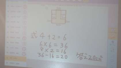 4年生の算数では、面積を学習しています。今日は凸型の図形の面積の求め方をタブレットを使って書き込み、スクリーンに投影して友だちの考え方をシェアしました。「ここを切って、別々に計算して・・・」と求め方を説明をしていました。