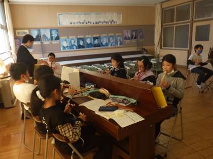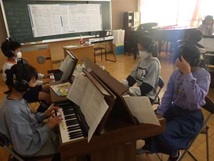 5年生の音楽では、「キリマンジャロ」という曲の合奏に向けて、パート練習中です。
