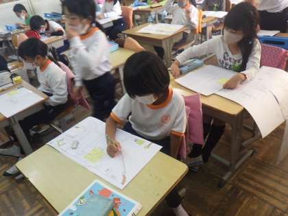 2年生の生活科では、「なるほどガッテン伊保の町」として、学区で見つけてきたことをもとに地図を作っています。