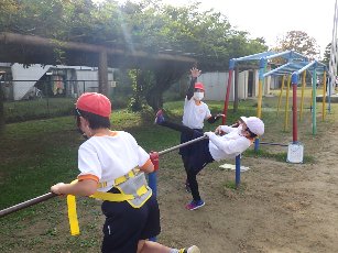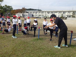 4年生の体育では、鉄棒の「逆上がり」と「足掛け後転」に挑戦をしています。逆上がりは子どもたちが補助具をつけて、逆上がりの体の使い方を感覚的につかんでいます。足掛け後転は、教師からタイミングと体の使い方を教わりながら、挑戦しています。