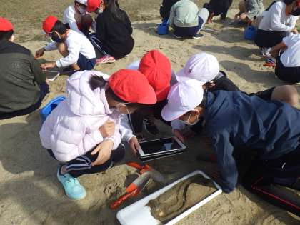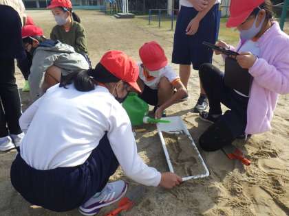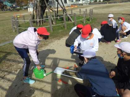 水によって土が削り取られる様子をタブレットで撮影したりして、興味深く観察していました。