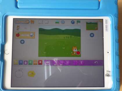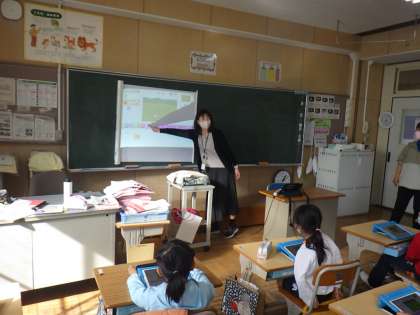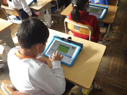 1年生では、ICT支援員さんに「スクラッチJr.」というアプリでアニメーションのプログラミングを教えてもらいました。