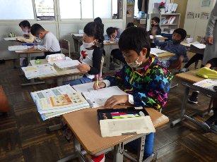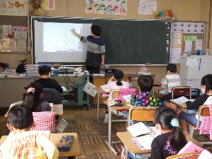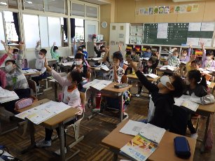 2年生は算数で、かけ算を学習中です。今日は、文章題を読み、8の段、9の段を使った式をたてて、計算しました。担任の先生が「わかる人?」と聞くと「ハイ!」と、ほぼ全員の手が挙がりました。