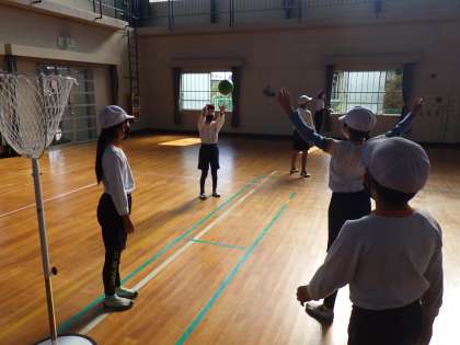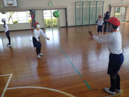 興味がわいたので、参観に行ってみると、バスケットゴールを玉入れのかごに変えて行うボールゲームでした。