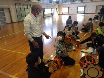 6年生は、総合的な学習の時間で10月の「棒の手」に続いて、東保見町「御殿万歳」を7名の保存会のみなさんから教えていただきました。