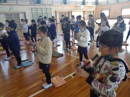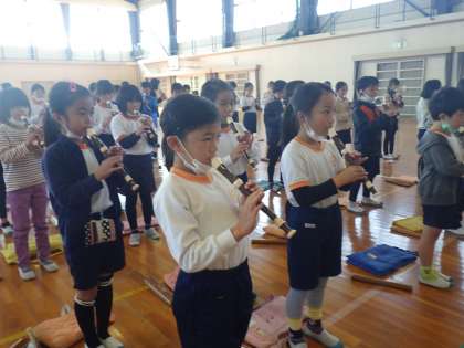 「シャボン玉を膨らますように息をいれます」と指導を受けると、子どもたちはあっという間にきれいな音色を奏でていました。