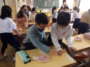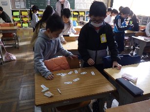 1年生の算数では、ひき算を使ったゲームで、計算の速さを競っていました。二人一組で、机の上に置いたカードを取り合います。先生が、「答えが2のもの!」というと、すぐに計算をして、さっとカードを取っていました。
