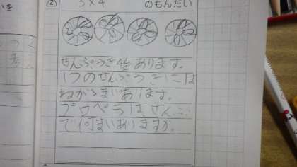 2年生の算数では、かけ算を学習しています。今日は、絵とことばを使って、かけ算の問題を作りました。子どもたちは教室内を見まわし、問題に使えるものを探して、問題文を作りました。
