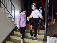 疑似体験セットを付けた児童は、介助役児童に声をかけてもらいながら、階段を上り下りし、カードの文字を読み、床に落ちたコインを拾い、自分の水筒のお茶を飲みました。体験直後の児童は、「階段や段差が全く見えず、『段差だよ』と言われなきゃ分からなかった」「黄色の文字が見えにくかった」「水筒の栓を回すのは、やりにくそうだった」と、感想を発表しました。