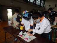 子どもたちは高齢者疑似体験をするために、膝と肘にサポーターを巻き、手首(1kg)と足首(1.5kg)に重り、指先が動きにくくなる手袋、視野が狭まるゴーグル、イヤーマフを身に付けました。