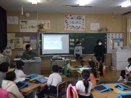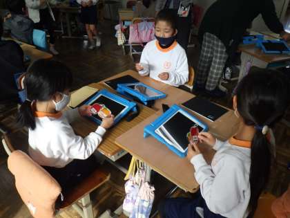 学習用タブレットに示されたテープ図を使って、たし算やひき算の問題づくりをしました。