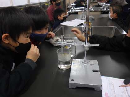 試験管に入れた水を温めると徐々に水面が盛り上がっていく様子をみて、「おー」と声が上がっていました。
