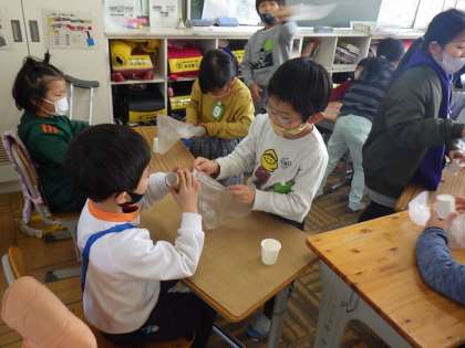 グループごとにおもちゃの作り方を説明して、作ったおもちゃで遊びます。