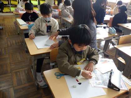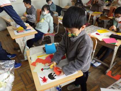 1年生の図工では、色紙を使って貼り絵で思い出の絵をつくっています。