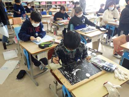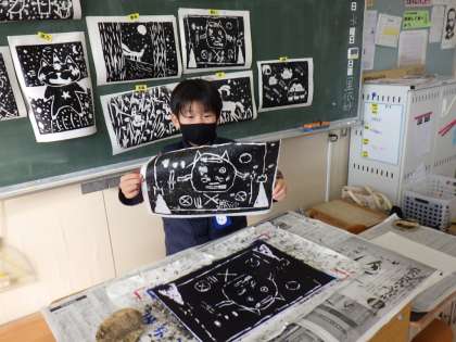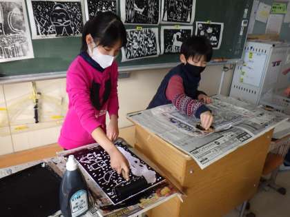 4年生の図工で製作している版画もいよいよ印刷の段階を迎えました。